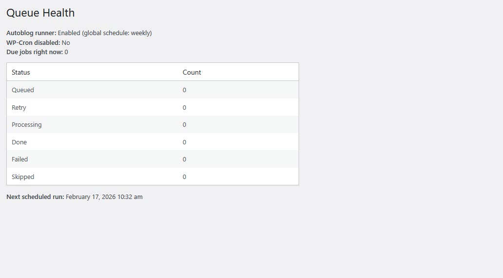 This alone eliminates 80% of autoblogging support issues.